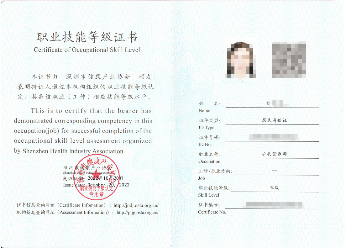 公共营养师职业技能等级证书采用国家人社部统一参考样式,由备案评价机构制作颁发,证书要素规范、信息完整,全国通用、终身有效,核心信息如下: