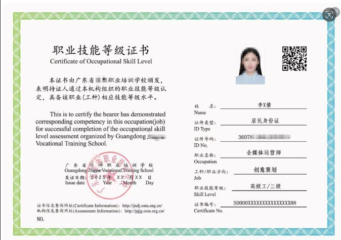 全媒体运营师职业技能等级证书采用国家人社部统一参考样式,由备案评价机构制作颁发,证书要素规范、信息完整,核心信息如下:
