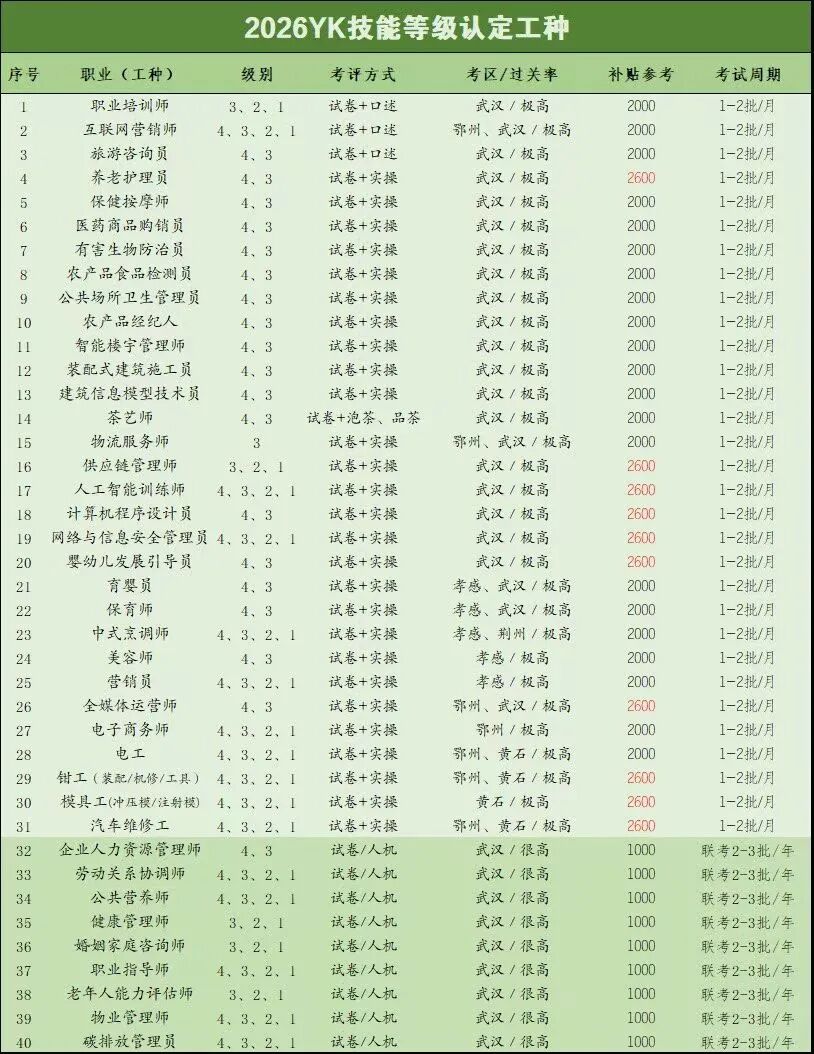 除此之外,职业技能等级证还有其他一些用途,比如抵扣个税(个别省份取消)、积分入户、评职等等,它和原职业资格证一样有五个等级,分别为初级(五级)、中级(四级)、高级(三级)、技师(二级)、高级技师(一级),在补贴上也延续了原职业资格证的标准,分别为初级1000元、中级1500元、高级2000元,但如今各省补贴政策不一,拿湖北来说,对于年度急需紧缺型技能人才补贴提升了30%,对于这类专业,不仅市场空缺大而且补贴相对更高,比如全媒体运营师、供应链管理师、人工智能训练师、计算机程序设计员、养老护理员、汽车维修工等等,我们不妨多向这类专业靠拢
